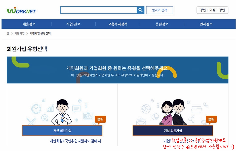 워크넷 회원가입을 하려면 개인과 기업회원을 구분해야 하는데요, 이 글을 보고 계신 대부분의 분들은 국민취업지원제도 참여를 희망하는 분들일 테니 개인회원으로 등록하시면 됩니다. 많지는 않겠으나 기업회원의 경우는 임 경험 프로그램 참여를 희망하는 경우에 등록하시면 됩니다.